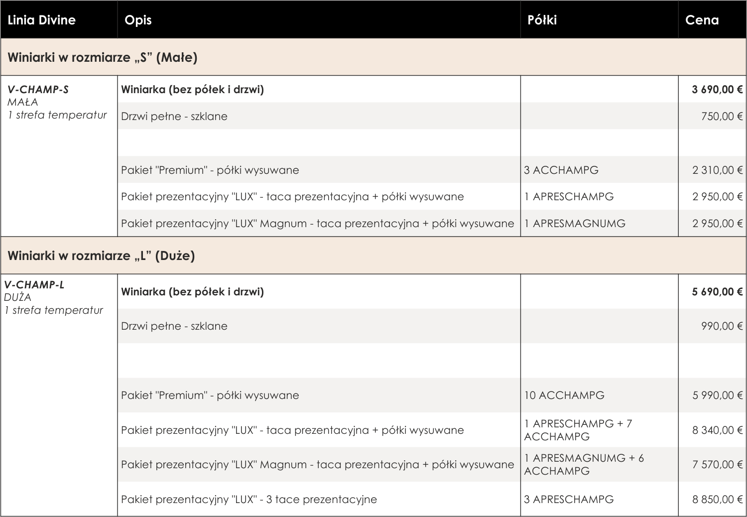 Linia „Divine” oferuje 2 rozmiary winiarek do wyboru. Wersja duża „L” pomieści do 91 butelek szampanów a wersja mała do 35 butelek. Oprócz gotowych pakietów półek klient może też samodzielnie dokonać wyboru półek w zależności od swoich potrzeb. Oprócz uniwersalnych półek wysuwanych, półki prezentacyjnej typu „Ice Bucket” na butelki standardowe (0,75l) istnieje możliwość zastosowania półki prezentacyjnej typu „Ice Bucket” na butelki Magnum (1,5l).