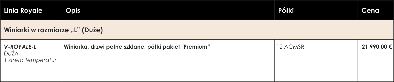 Royale jest dzieckiem wyjątkowej współpracy pomiędzy rzemieślnikami, inżynierami i projektantami, czego efektem jest urządzenie łączące elegancję, wysoką jakość wykonania oraz stabilność warunków przechowywania. Jej spektakularny i charyzmatyczny design jest w stanie w pojedynkę zdefiniować na nowo kontury pomieszczenia. Najnowocześniejsze rozwiązania takie jak pełne szklane drzwi z 99% ekranowaniem U.V., opatentowany filtr tkany dla kontrolowania jakości powietrza, pochłanianie zewnętrznych wibracji przez strukturę korpusu szafy czy sprężarka o zmiennej prędkości w pełni zadbają o twoje najlepsze winne etykiety.